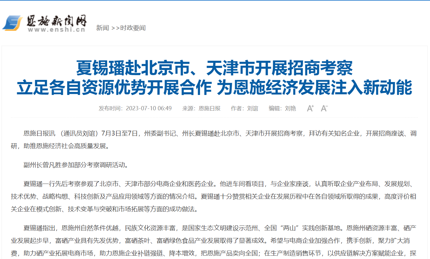 7月,恩施州州委副書記、州長夏錫璠,副州長曾凡勝,州政府秘書長程飛一行蒞臨奧泰康北京總部考察調(diào)研,奧泰康期待借助自身CRO在醫(yī)藥科技成果轉(zhuǎn)化方面的豐富經(jīng)驗與優(yōu)勢,助力恩施州傳統(tǒng)中醫(yī)藥和硒產(chǎn)品的新藥科技成果轉(zhuǎn)化,實現(xiàn)優(yōu)勢互補(bǔ)、資源共享、共同推動生物醫(yī)藥行業(yè)高質(zhì)量發(fā)展。