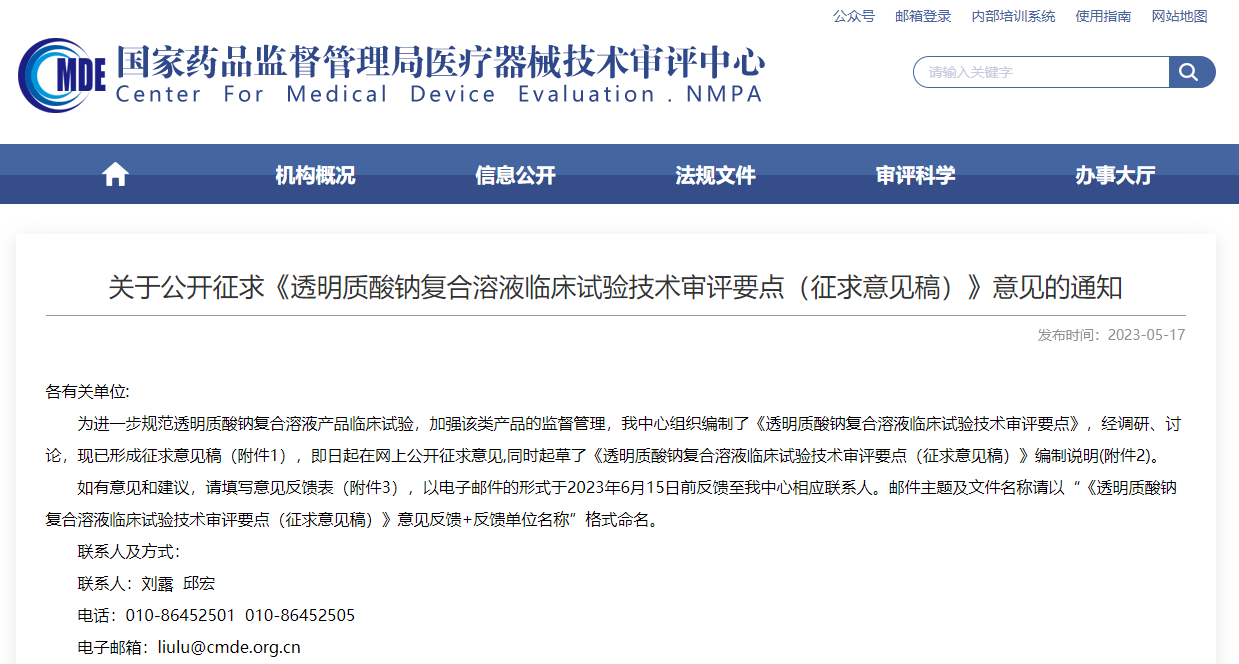 ▲ 《透明質(zhì)酸鈉復(fù)合溶液臨床試驗(yàn)技術(shù)審評(píng)要點(diǎn)(征求意見稿)》 (來(lái)源:器審中心)