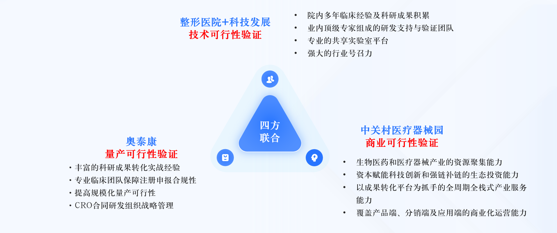 北京市整形醫(yī)學概念驗證中心項目,由四家單位聯(lián)合申報實施。其中北京八大處整形科技發(fā)展有限公司聯(lián)合中國醫(yī)科院整形外科醫(yī)院完成技術可行性驗證,北京奧泰康醫(yī)藥技術開發(fā)有限公司負責量產(chǎn)化驗證,中關村醫(yī)療器械園有限公司完成商業(yè)化驗證,四方相互協(xié)同,構建“醫(yī)研產(chǎn)銷”一體化生態(tài)。