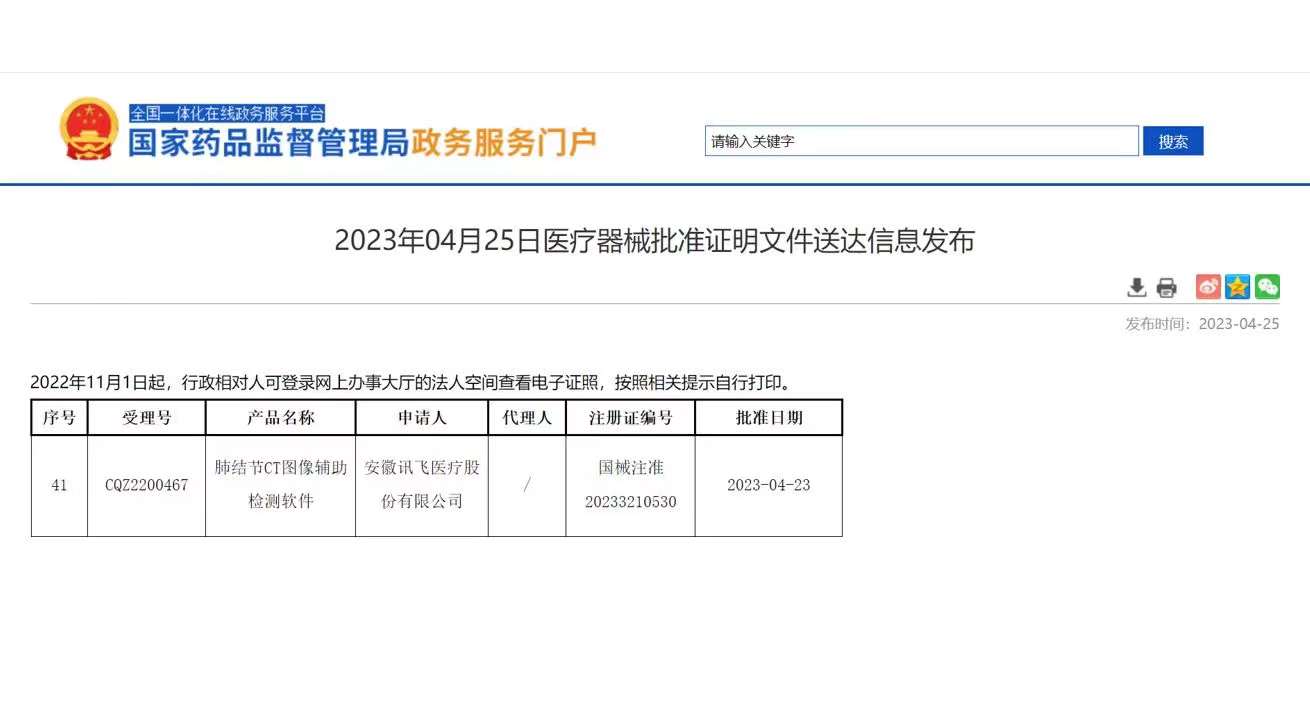 2023年4月25日,經(jīng)國家藥品監(jiān)督管理局公示,安徽訊飛醫(yī)療股份有限公司的“肺結節(jié)CT圖像輔助檢測軟件”(國械注準20233210530)獲得NMPA批準上市,奧泰康承擔本項目臨床試驗服務,系2023年奧泰康助力獲得的第7張三類醫(yī)療器械注冊證,也是公司累計助力獲得的第12張人工智能(AI)醫(yī)療器械注冊證。