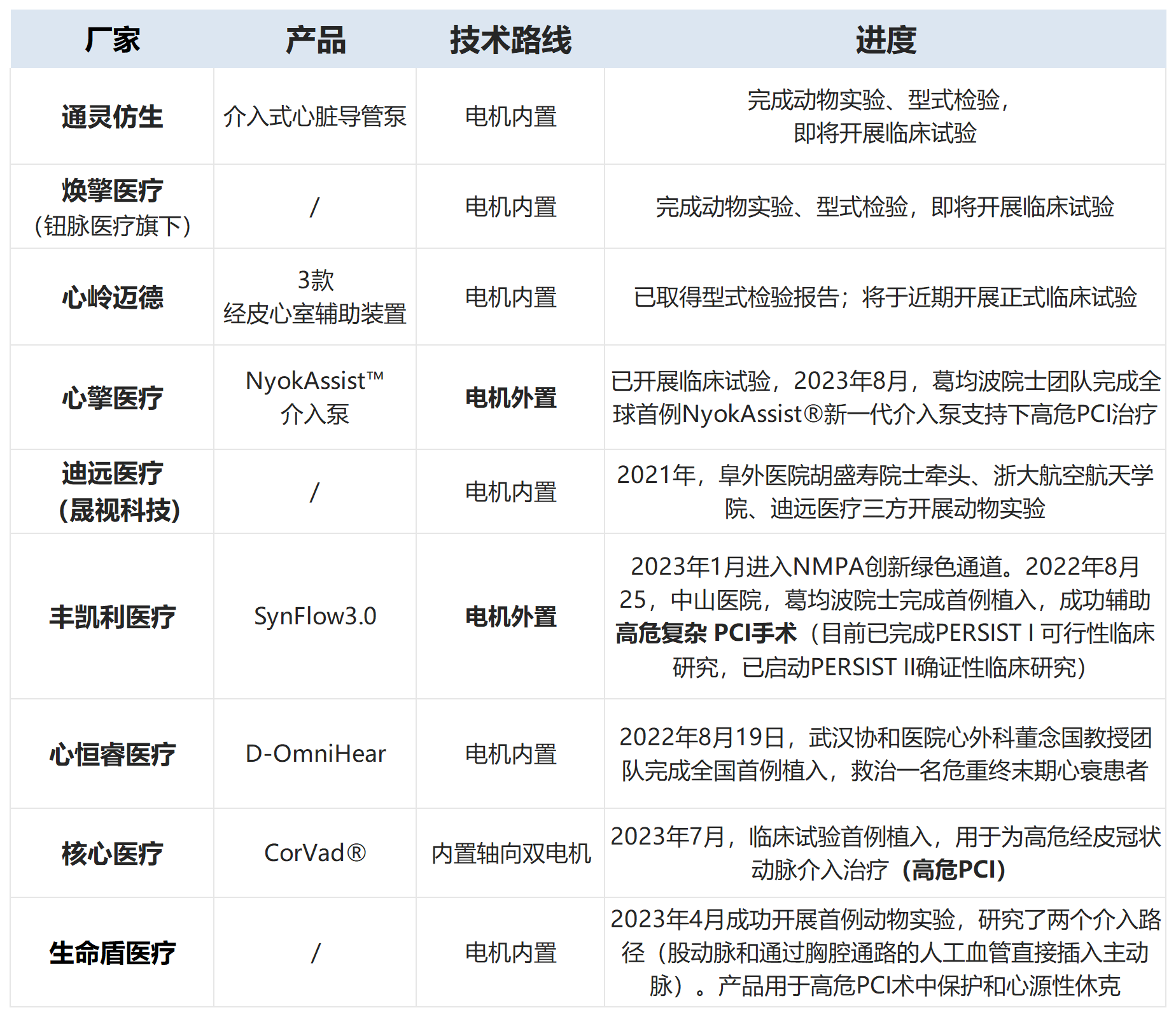 介入式人工心臟是高技術(shù)、高門(mén)檻賽道,國(guó)內(nèi)有少數(shù)創(chuàng)新企業(yè)布局。其中,心恒睿醫(yī)療、核心醫(yī)療、通靈仿生、心嶺邁德、晟視科技、心擎醫(yī)療、豐凱利醫(yī)療等企業(yè)不僅在資本寒冬期逆勢(shì)完成融資,且相關(guān)產(chǎn)品推進(jìn)順利,進(jìn)展極快。