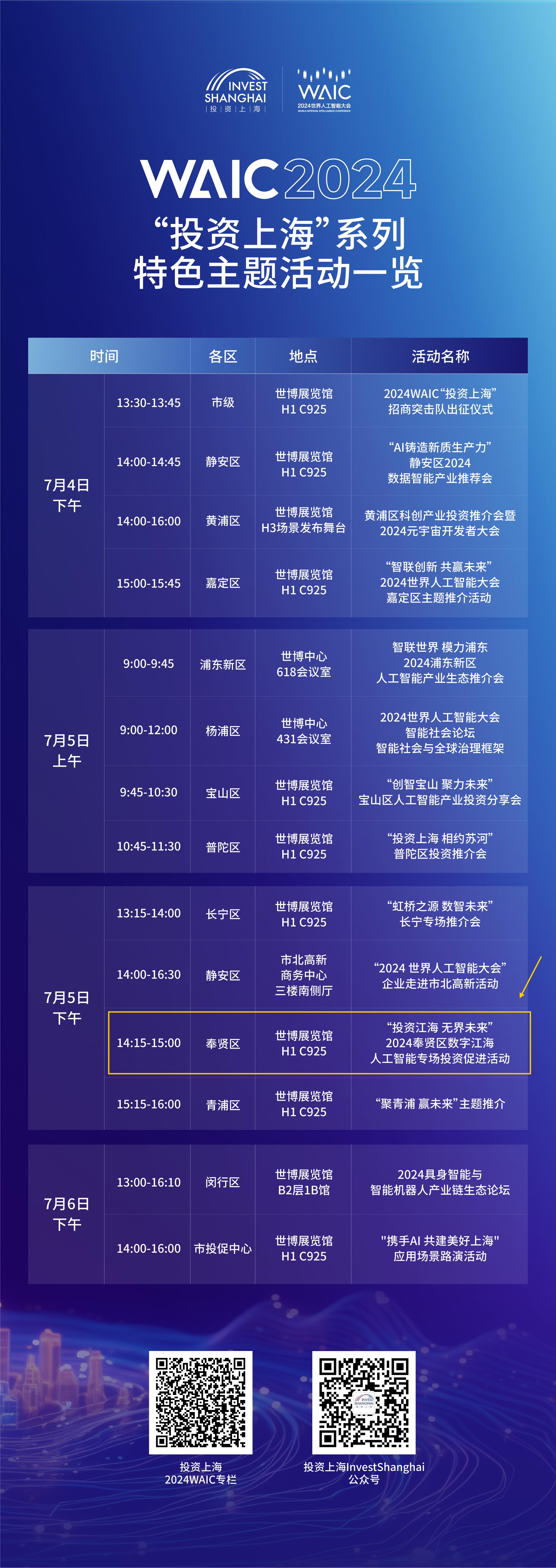 WAIC 2024是人工智能行業(yè)的世界盛會,為把握大會激發(fā)的全新投資機遇,推動展商變投資商,市投促中心聯(lián)合各區(qū)投促部門,將在大會期間舉辦一系列精彩紛呈的特色主題活動,向世界分享上海AI產(chǎn)業(yè)投資機遇。奧泰康受邀參加【“投資上海”系列特色主題活動】,并在“投資江海 無界未來”2024奉賢區(qū)數(shù)字江海人工智能專場投資促進活動專場圍繞腦機接口領(lǐng)域展開主題分享,屆時將與醫(yī)療行業(yè)同仁共同交流,期待各位蒞臨現(xiàn)場。